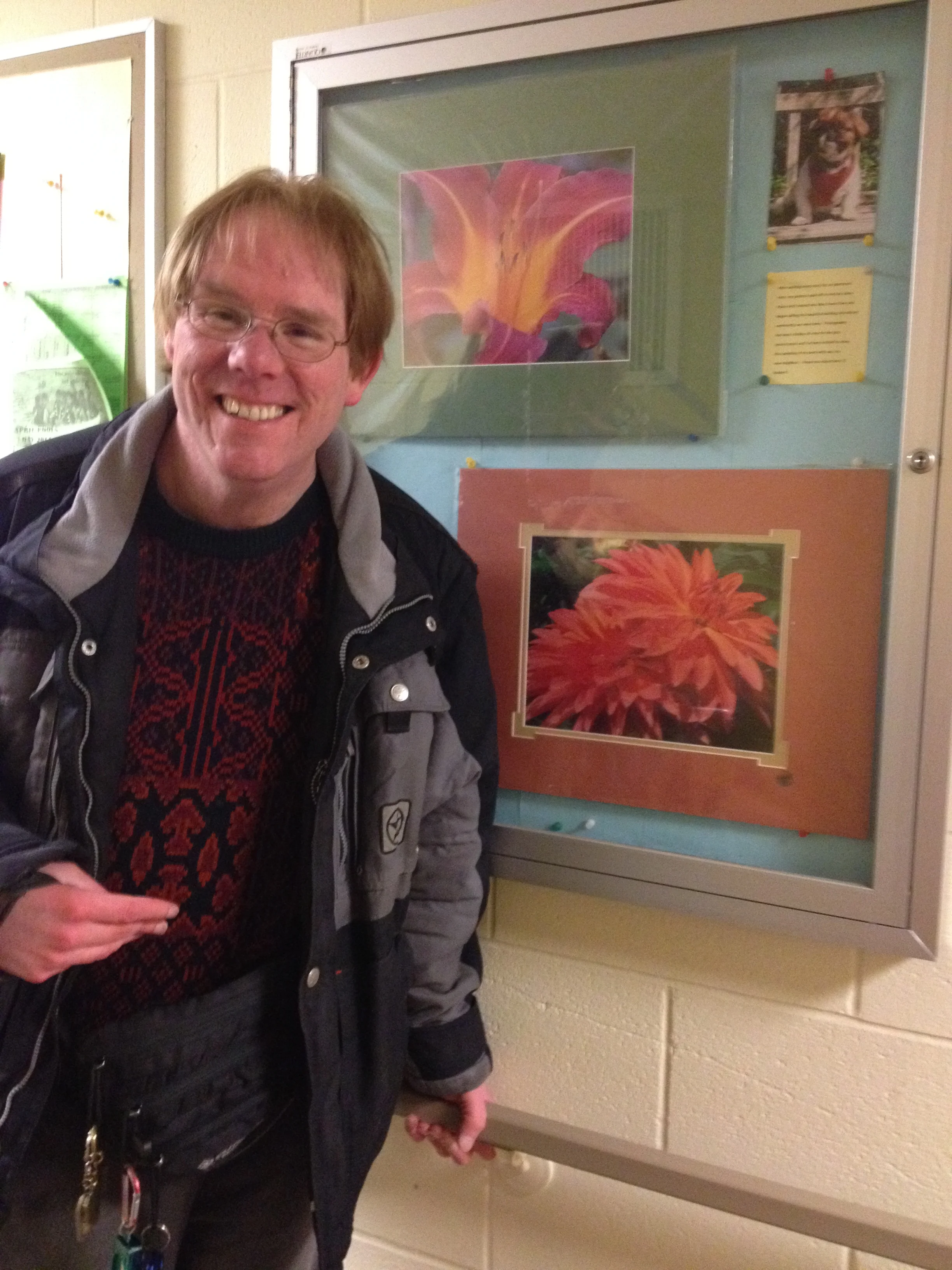 (Pictured is Robby, who loves photography. Above pictures he's taken are displayed in the apartment complex he lives in.)